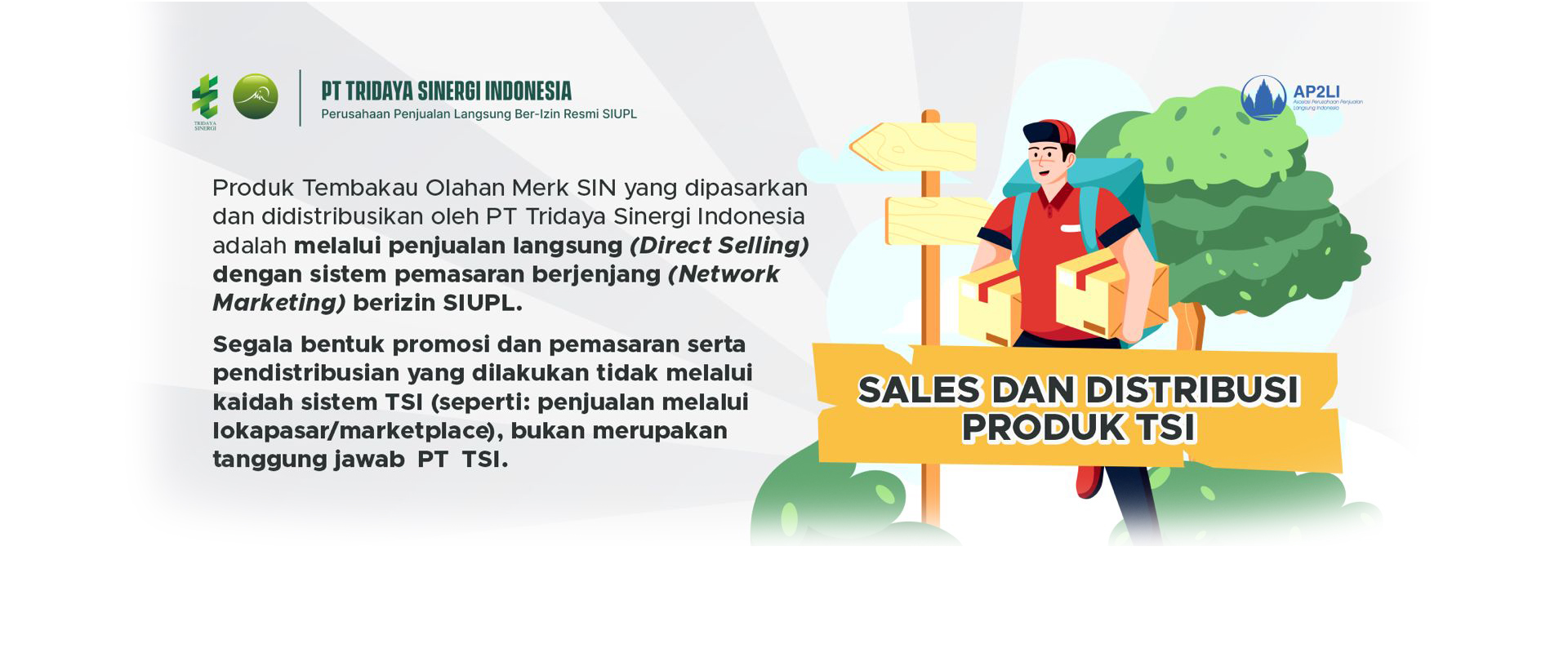 Kami PT Tridaya Sinergi Indonesia, adalah Perusahaan Direct Selling Network Marketing bernomor Izin SIUPL : Nomor 197/SIPT/SIUPL/12/2020, yang memasarkan 14 (empat belas) variant SIN diantaranya : SIN Platinum TSI, SIN Kujang Mas TSI, SIN Provost 19 TSI, SIN Sinergi Mind, SIN Sinergi MIND Menthol,SIN Platinum Filter, SIN Kujang Mas Filter, SIN Sapu Jagat, SIN TRUST, SIN TRUST Menthol, SIN Krakatau, SIN New Normal Menthol, SIN New Normal Mind, SIN New Normal ORG.
